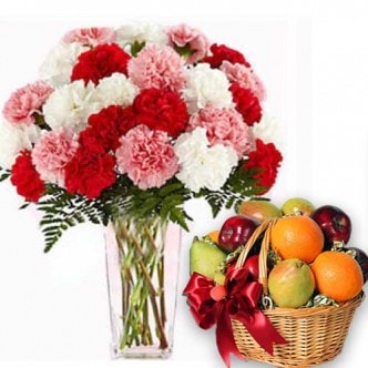 A refreshing combo of 10 mixed carnations paired with 2 kg seasonal fruits.