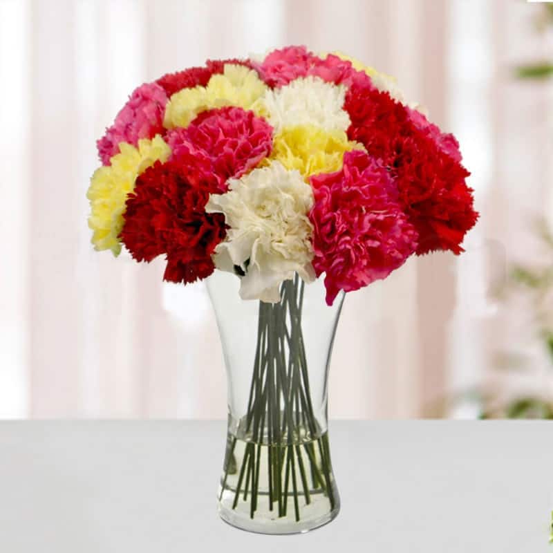 A colourful glass vase arrangement of 12 mixed carnations designed for lasting impressions.