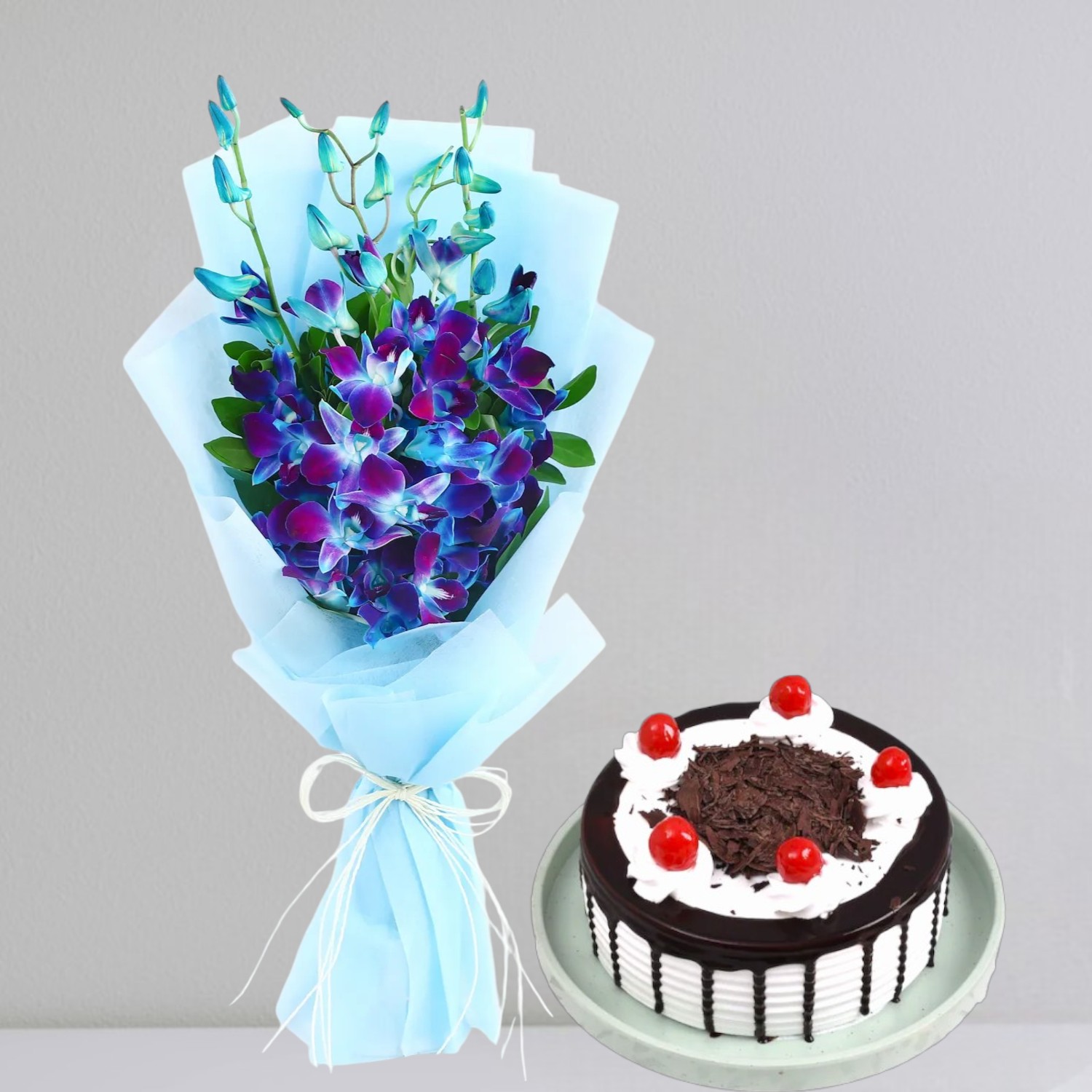 A classy combo of 5 blue orchids paired with half kg eggless black forest cake.