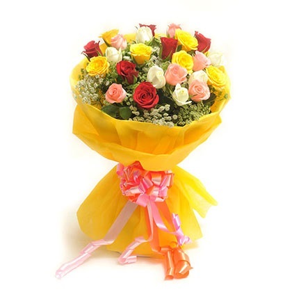 A cheerful bouquet of 25 mixed-colour roses wrapped in premium paper with ribbon bow.