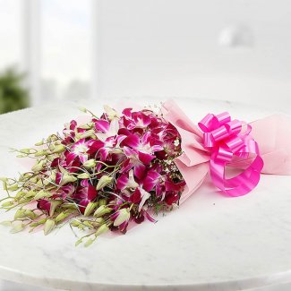 Elevate your gifting with this exotic purple orchid bouquet in Pune, featuring 10 fresh purple orchids wrapped in soft pink paper with seasonal fillers and tied with a dark pink ribbon. Orchids are admired for their exotic beauty and longevity, making this bouquet a premium floral choice. Ideal for customers searching orchid bouquet delivery Pune, purple orchid flowers, or romantic floral gifts. Related Keywords: purple orchids Pune, exotic orchid bouquet, premium flowers delivery Pune. Best For: Romantic gifting, anniversaries, birthdays, elegant surprises.