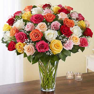 A luxurious glass vase arrangement of 48 mixed long-stem roses in vibrant colours.