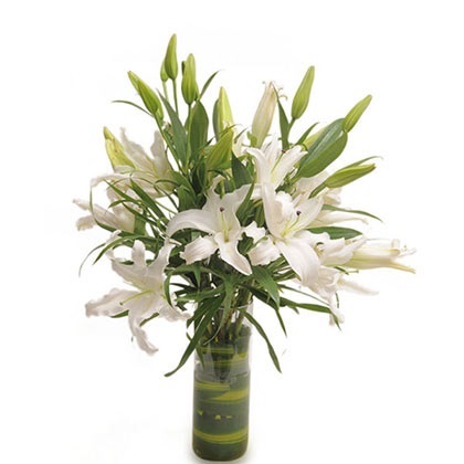 A serene glass vase arrangement of 6 white lilies with green fillers and dracaena.