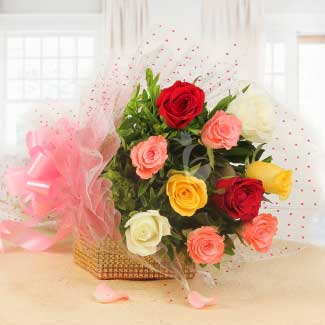 A cheerful bouquet of 10 mixed roses wrapped in cellophane with green fillers and pink ribbon.