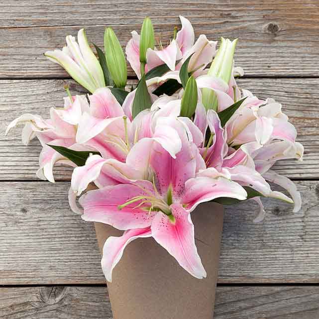 A balanced bouquet of 5 pink and 5 white oriental lilies wrapped in elegant paper.