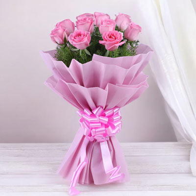 A romantic bouquet of 12 fresh pink roses with seasonal fillers, wrapped in pink paper and tied with a ribbon.