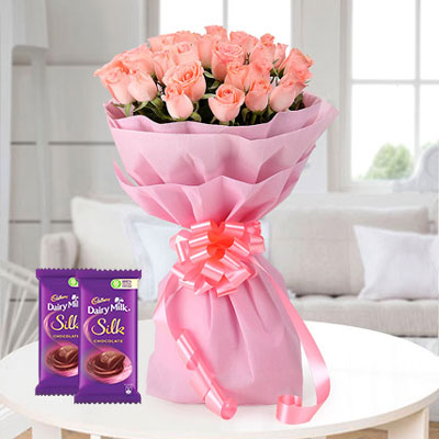 A graceful bouquet of 20 pink roses with green fillers, paired with Cadbury Silk chocolates for a sweet surprise.