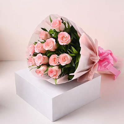 A graceful bouquet of 12 pink roses with green fillers, wrapped in pink paper and tied with a decorative ribbon.