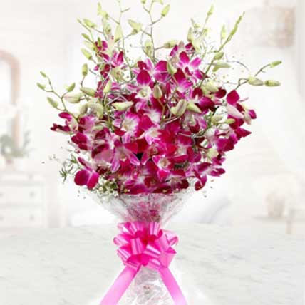 Share elegance with this purple beauty orchid bouquet in Pune, featuring 6 beautifully bloomed purple orchids wrapped in pink paper and finished with a matching ribbon bow. Simple yet refined, this bouquet is perfect for those who prefer understated luxury. Ideal for customers searching purple orchid bouquet Pune, simple orchid gifts, or same-day flower delivery. Related Keywords: purple orchids Pune, orchid bouquet online, elegant flowers Pune. Best For: Friends, family, birthdays, thoughtful gifting.