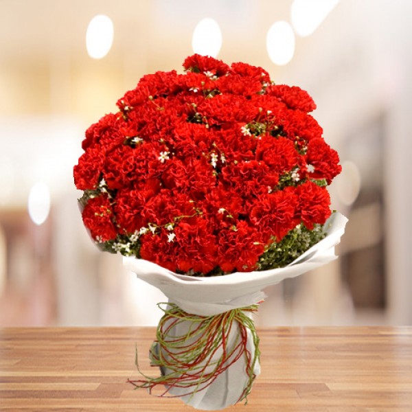 A graceful bouquet of 30 red carnations wrapped in elegant off-white paper.