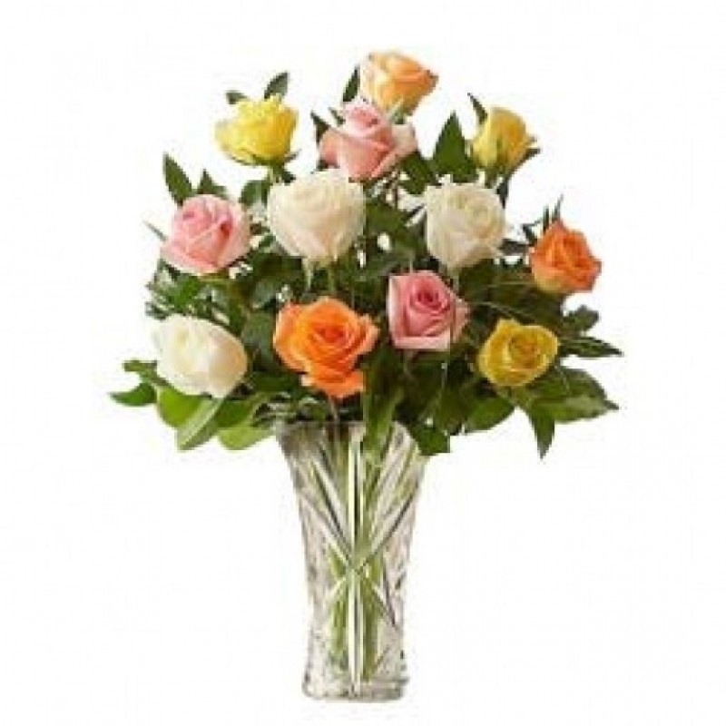 A classy vase arrangement of 12 assorted roses in white, yellow, pink, and jumilia shades.