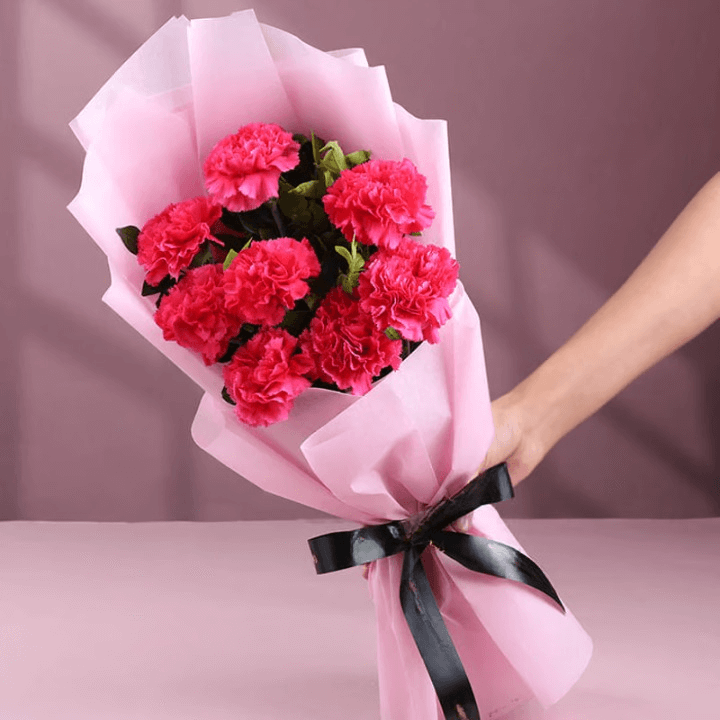 Elegant bouquet of 8 pink carnations wrapped in light pink non woven paper. Ideal for romantic flower delivery and same day delivery in Pune and Katraj.