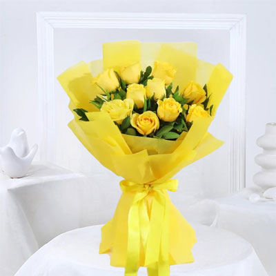 A cheerful bouquet of 12 yellow roses with seasonal green fillers, wrapped in yellow paper and tied with a ribbon.